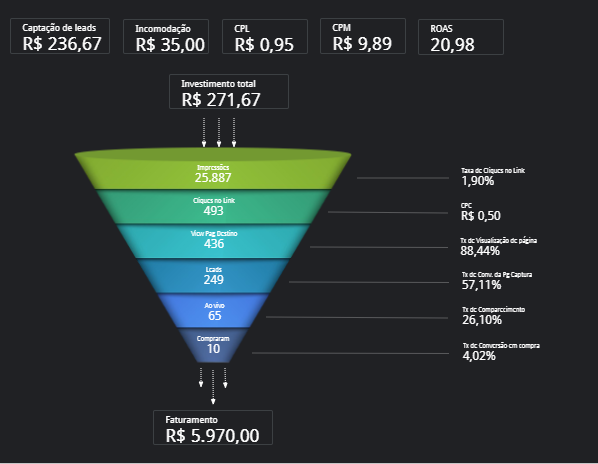 Fiz parte de um lançamento semente fazendo a coprodução e a gestão de tráfego pago, onde investimos R$ 271,67 e tivemos o retorno de R$ 5.970,00.